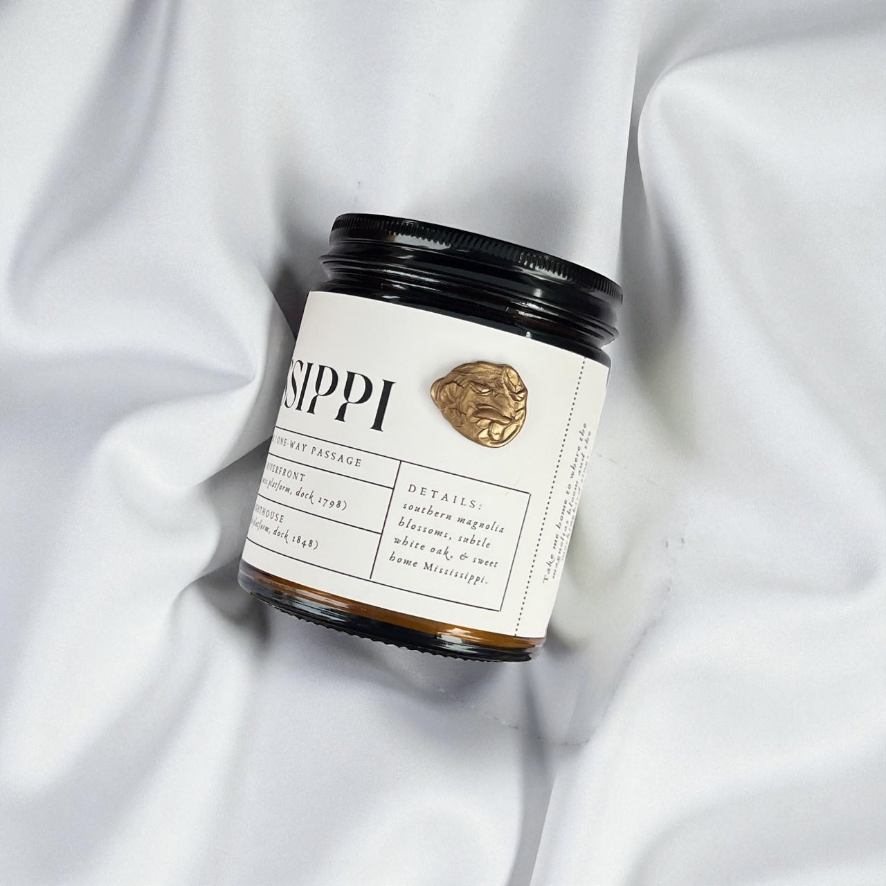Each piece is hand-poured with our premium coconut soy wax blend and clean fragrance oils, and the packaging includes subtle nods to Mississippi history and icons such as the mockingbird, the Natchez riverfront, and the Biloxi lighthouse. A custom magnolia wax seal offers a refined finishing touch.
